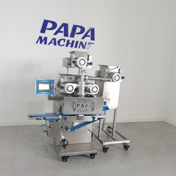 The Papa 188B automatic four hoppers encrusting machine is a versatile and efficient machine that can handle a variety of filling options. With its ability to make a three-fill skin or a two-color two-fill skin, this machine is perfect for bakeries and food manufacturers looking to increase their production capabilities.